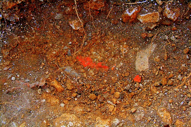 Immediately to the south of this probable post hole, the chalk rubble fill was further excavated out away from the house. This revealed that beyond the solid bed of mortar (free of inclusions), which formed the foundation to the wall, a friable mortar surface extended further out under the chalk fill of at least this part of the farmyard. Associated with this friable mortar was a firmly embedded fragment of brick and of slate (clearly shown in the colour-enhanced photo above). Therefore the chalk rubble fill, which is older than the demolition rubble (it sits under it), is almost certainly as old or younger than the construction of the house itself (from which the slate and brick probably originated). When the foundation trench was dug, it may have been quite wide, and left open during at least the initial construction of the house, before it was backfilled with chalk rubble, sealing the fragment of brick and tile – which may have been broken during the transport of the building materials to the site. Further excavation out into the farmyard and alongside the outer load-bearing walls of the house would be required to further understand his particular feature.
