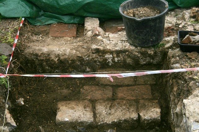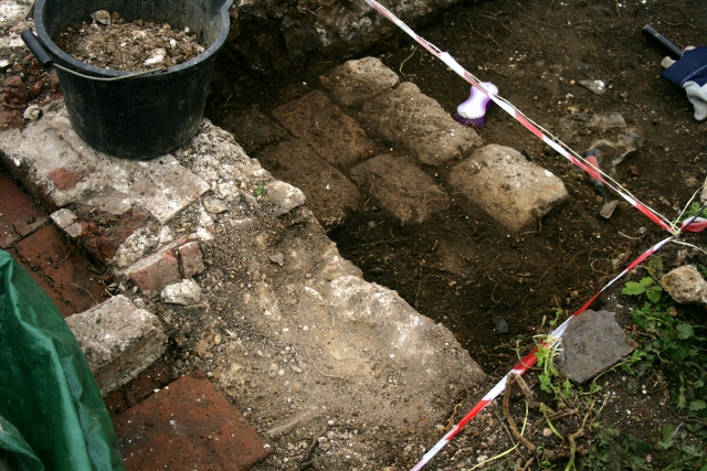 The very front of the house was found to have 3 horizontal courses of roughly squared blocks of unmortared stone, underneath 20-30cm of demolition & rubbish fill, all embedded in a dark brown loamy garden soil (the bottom of which we have yet to excavate). However the stones stopped before where we conjecture part of the front door may have been. Lying on top of this fill an iron water-pipe had been found heading across the front of the house from the adjacent farmyard. The farmyard portion was clearly in-situ, and it meets the front of the house at about the same level as the floor of the house itself. Unfortunately the 1950’s bulldozer has cut through it at this point, so its further course in front of the house is uncertain. There was no sign of any path leading to our possible front door. Perhaps it was in the next grid square which has yet to be excavated. For the time being the house frontage remains a mystery.