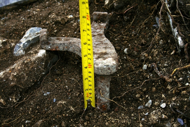 Under it was yet more brick and flint rubble which has yet to be excavated. It was lying flat, just a couple of centimetres away from the boundary wall. It may have been leaning against the wall, and fell underneath it, when it collapsed. Part of the collapsed wall had caused it to break into two three or more pieces.
