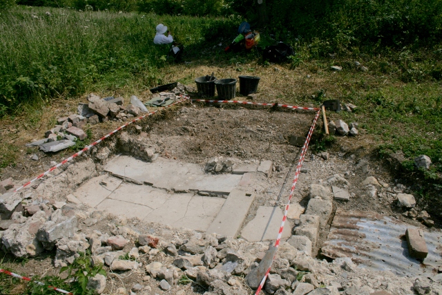 Sunday was another very hot sunny day, which partly explains why just two volunteers came to dig. The area excavated was immediately to the east of the outside toilet and immediately to the south of the front garden boundary wall – an area of about 1.5m by 2m. The tools used were a chillington hoe (a mattock like tool), trowels and brushes. The demolition rubble we dug through was generally dry and dusty, though deeper levels did contain some moisture.