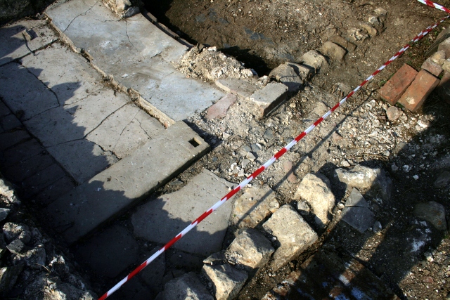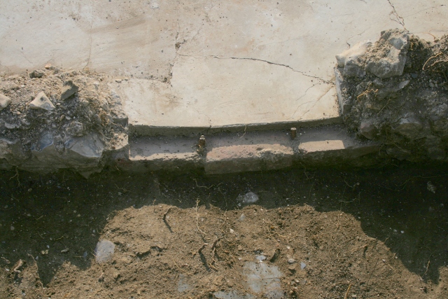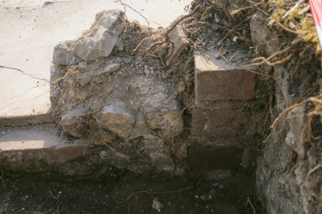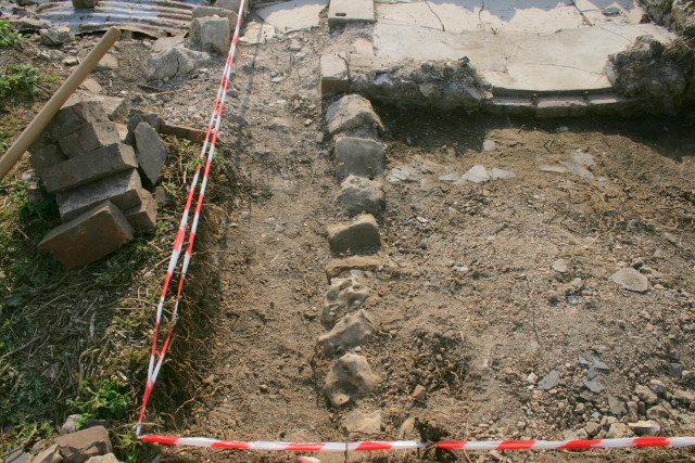 Sandwiched between the garden boundary wall and this toilet wall we uncovered three courses of a brick quoin (context 98). These were all header laid, across the complete width of the wall. They merely butted against the adjacent walls.
