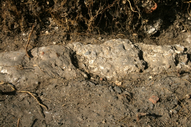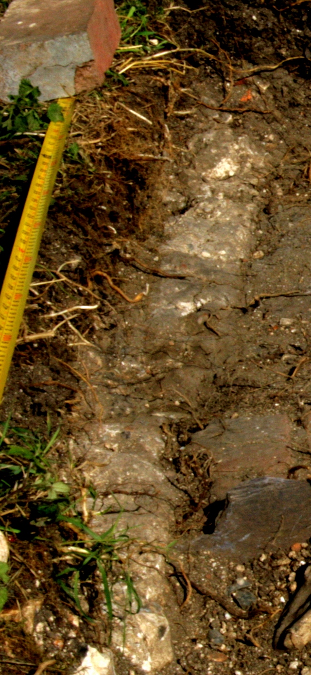 The sill of the gateway was of an uneven mortar surface – part of the wall foundations – worn smooth by over a hundred years of the tenants’ feet. The light coloured parts of this structure showed no wear from peoples’ feet – so were probably the site of the pillars between which the garden gate would have been affixed.