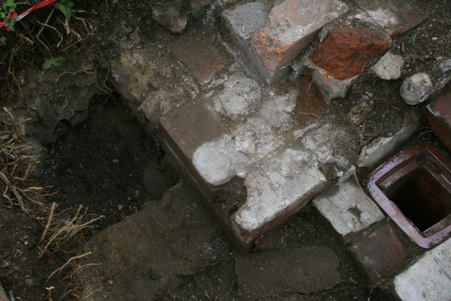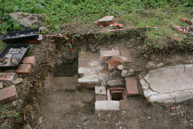 The first target of the day was the beautifully preserved concrete gully which fed into the salt glazed stoneware ‘gully drain’. Situated directly outside the kitchen/washhouse window, the most likely location for the kitchen sink, this suggests it is likely to have been used as a drain for ‘grey-water’ rather than to collect rainwater for a water-tank or well.