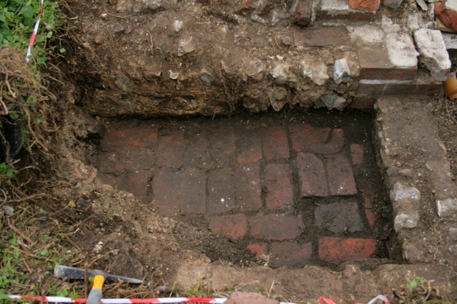 It was only about 1m wide and a more or less accurate plan (from papers dated 1922) indicated it may be about 2m long. So we have so far excavated about 2/3 of it, and it is a real gem! Just inside the threshold we found a compacted earth floor, but further digging revealed that this lensed out to reveal a brick paved floor underneath. Immediately under the earth surface was a large quantity of coal and some charcoal.