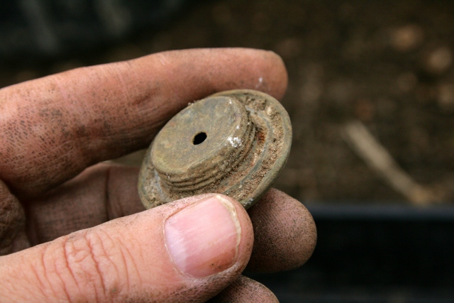 The vast majority of our finds have been from this area to the south of the cottage. Bob Phipps who lived there as a child in the ’30s remembers a well being located here. The find of the day was a twisted copper alloy wire handle – could this have been a bucket handle?