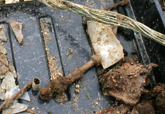 The relative absence of our usual rusty nails is strong evidence for the bulldozer having pushed all the window and roof timbers – to which the nails would have been attached – across the site, from west to east and they would have been added to the large demolition rubble mound on the east side of the site.
