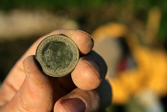 1927 – George V – farthing. Our third coin – a farthing – dated 1927. It is interesting to note that this and the 2 halfpennies found earlier, all dated from the reign of George V. His reign was for about a quarter of the cottage’s time of occupation.