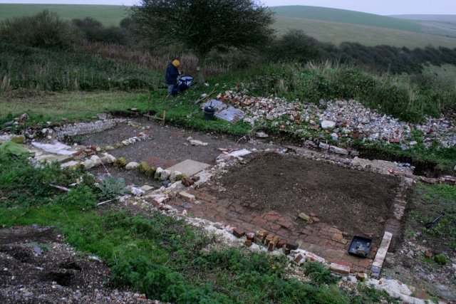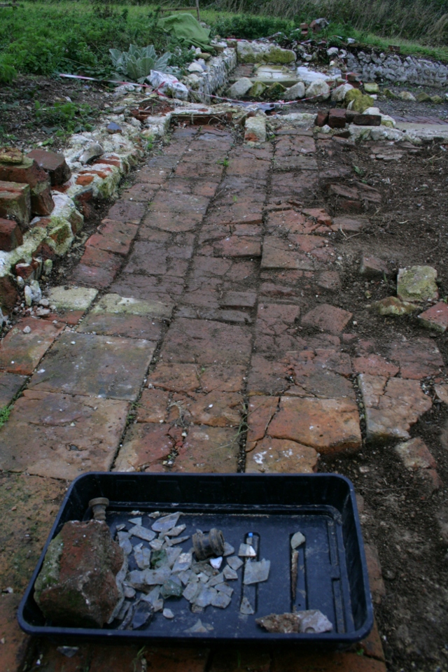 As expected there very few finds; the strangest of which was a hard black plastic screw fitting ‘something’ – a cross between a table lamp light fitting and a fancy hose pipe connector. The surviving terracotta floor tiles were all nicely cleaned back, as were all the external and internal flint and brick wall lines.