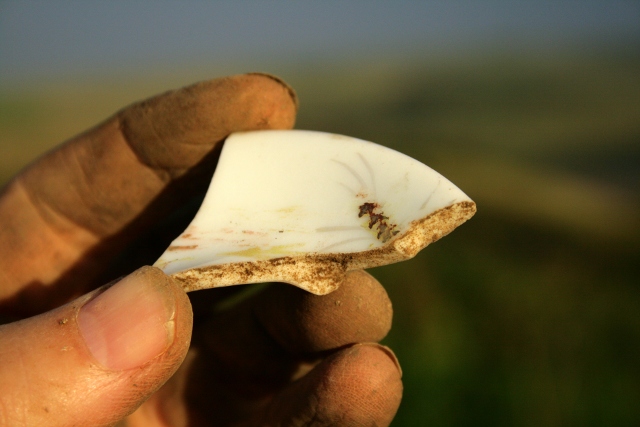 Decorated dinner plate shard from partially excavated grid square S of cottage, E of ~1880 extension.