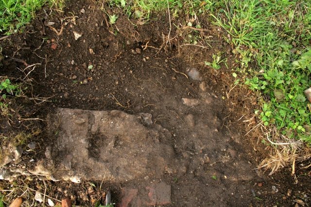 The front garden gateway was opened up to its immediate north. It was hoped that beyond the garden wall both the modern and original ground surfaces would more or less coincide. Thus a gentle slope down from the west, through the original gateway could be easily dug to enable next weekends’ visitors to enter through the original gateway to the site. However, I was surprised to discover a much deeper layer of demolition rubble beyond it than I had expected.