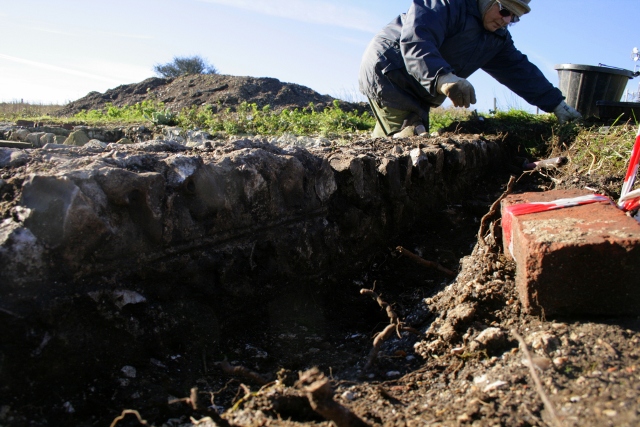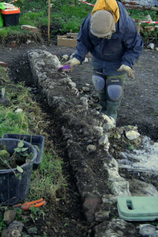 The north side of the front garden wall has now (just about) been completely excavated down to the surviving 1942 ground surface. At its western end it was about a foot above the ground surface on the other side of the wall. The chalk rubble found beside the remains of this wall was backfill; when a small sondage was dug down through it, a mortar base was discovered underneath it, part of the wall’s foundations.