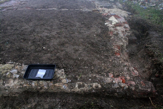 The north side of the garden boundary wall was also further excavated. Yet more flint cobbles were discovered on the pathway immediately in front of the front garden gateway. There were strong indications, based on wear and iron staining, of flints having been added on top of an older cobbled surface by way of repairs. Protected by an adjacent bank, it had accumulated an overlying fill of demolition rubble, which included a number of finds.