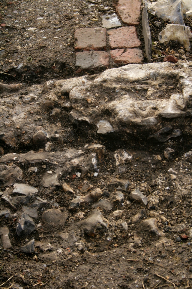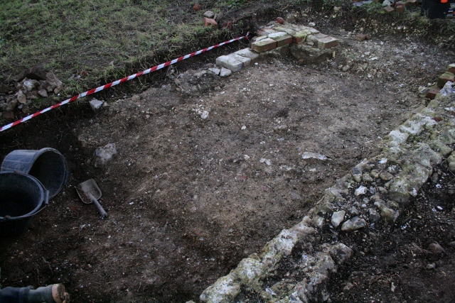 - then southwards encompassing the east side of the front garden path (a 4x1m area which has not yet been excavated – there is a memory of possible steps up to the shed which it would be nice to find if we can), continuing along the just about fully excavated outside of the wood-shed and laundry copper foundation on the east side of the cottage (hard up against the base of the demolition rubble mound), then fully excavating the partially excavated original ground surface beyond, down the side the outside of the chimney, down to 1 metre east of the south-east corner of the cottage (an unexcavated area of about 3 or 4 square metres);