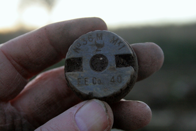 The solid zinc screw base of a mark 1, No 36M ‘mills bomb’ (hand grenade) found was yet more evidence of the WW2 training which was responsible for the complete destruction of the cottage, barns and perimeter walls during the latter half of the war.