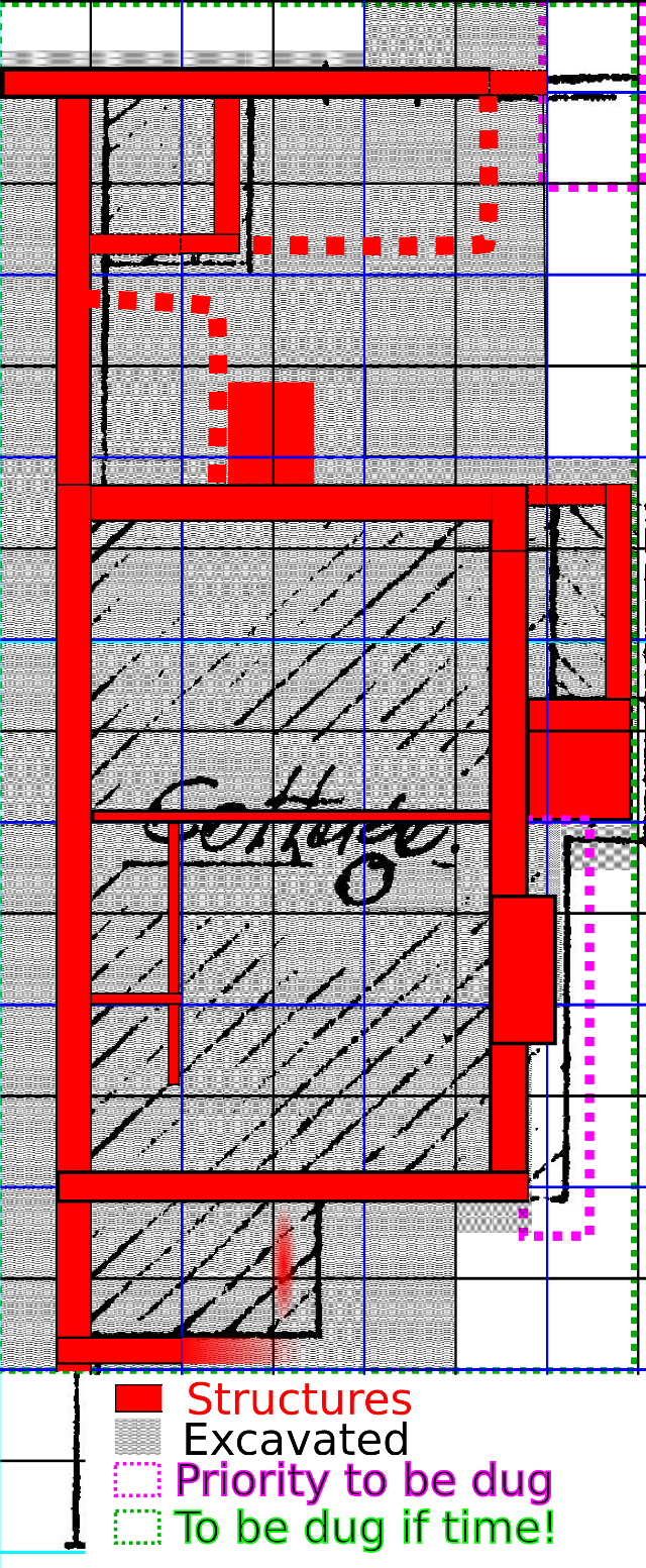 The purpose of this trench extension would be to better facilitate a complete reconstruction of the cottage, and especially its immediately associated features, which we hope to base on a laser scan by SeSurveying. I really hope we will manage at least 4 more square metres (about 4 more days digging – a minimum of two more weeks):