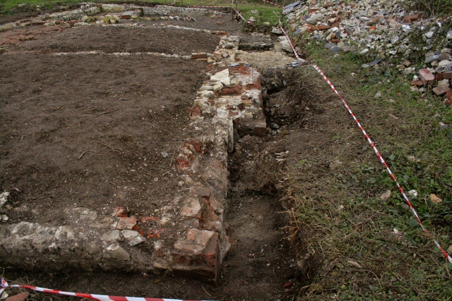 Sunday was another cold dry day, and the sun even popped out for a quick visit from behind the clouds! Some good digging was done in a very narrow slot along the southern half of the outside of the east side of the cottage. This was down through the demolition rubble fill to the original ground surface.