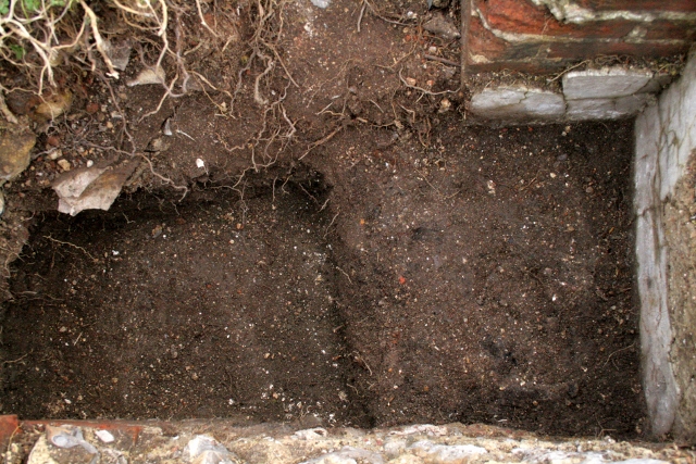 The demolition fill against the outside of the east wall of the cottage, between the base of the chimney breast and its south-east corner, was fully excavated. The full extent of the damaged section of the wall was revealed, and included a small crater in the ground surface matching that of the wall. Because the cut of the crater had a sharply defined boundary, and was entirely filled by powdered brick, mortar, and flint, this was almost certainly caused by second world war ordnance. However the type of ordnance used was not able to be determined for no shrapnel was found (or perhaps, but unlikely, found but not identified). Whilst a metal detector could be used to search for possible shrapnel targets, all other such ground surfaces contained a relatively high density of rusty nails and other metal – both ferrous and non-ferrous – objects, such that a metal detector is of little use.