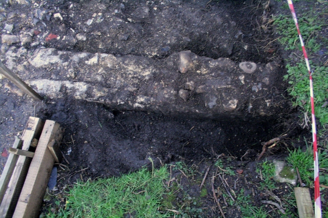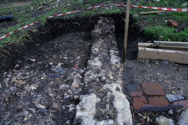 A small trench extension was made along the south side of the wall to compare the levels of the original ground surfaces on either side of the wall. As expected, though the bulldozed demolition fill starts to rise (or more accurately, the downwards slope was reduced) as it begins to form the large mound of demolition rubble further to its east, the underlying original ground surface starts to drop off relatively steeply.
