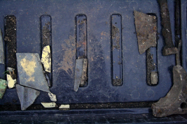 - A reasonably large quantity of rusty nails and other metal objects of an unknown nature, a range of glass shards (the only window glass shards were of the thinner type), and much more!