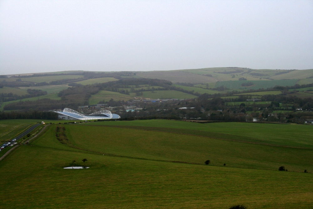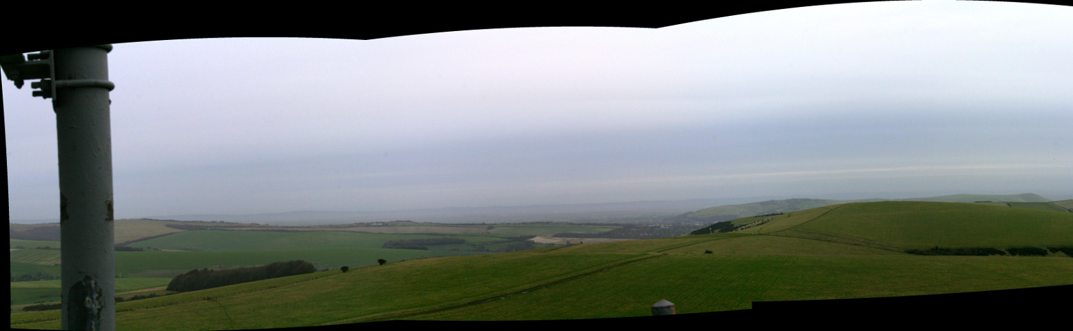 - Panoramic view from communications mast on Newmarket Hill looking NE at Newmarket Plantation and Lewes; click to enlarge