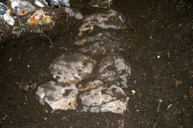 Looking NE at excavation of cobbled flint surface between front garden gate & front door of cottage; 9th February 2014