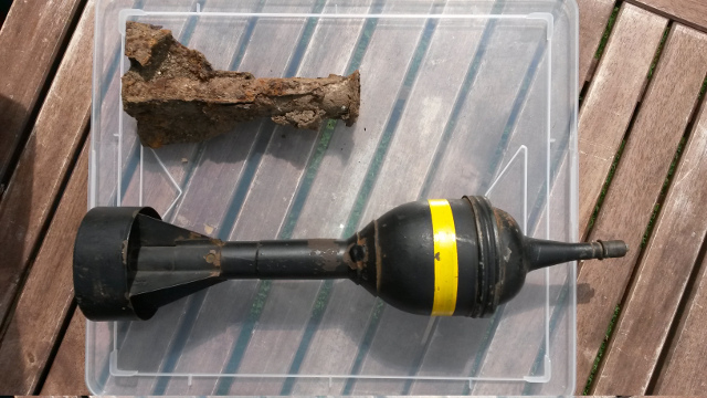 Also new for me was to see the original of our recently identified No. 69 (Bakelite plastic) grenade fragments. Our remains, which resembled screw threaded bulb fittings for a table lamp, were the top part of these grenades. The body shell, which would have held the high explosive charge, would have shattered on impact and as yet no such fragments have been identified from amongst our finds. Also yet to be identified from our finds were the firing pins and the ball bearings that were attached to either end of a tape which unravelled in flight and that thus automatically primed the grenade whilst it was in flight. The tape was almost certainly of cotton and would have rotted away. Apparently they were very good at producing a bang and a flash, and so were commonly used in training exercises. However, if the thrower was unlucky, the ball bearing could be blown back in their face causing them significant damage. I found a YouTube video which gives some helpful information about their use and construction.