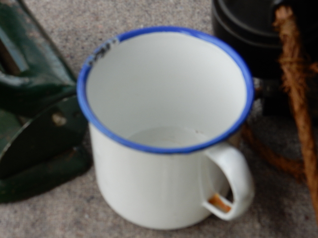 We had excavated a white enamel mug from inside a ceramic drain in front of the cottage. It was found along with an enamel saucepan handle, a bottle of OXO, and a rusty food can (empty); all possible remains of a camp meal. I had speculated whether the cup might be of military issue. I was wrong! Army issue cups were not only larger, they were an essential part of their kit, and if lost or damaged there would have to be a very good reason for it, or the culprit certainly be put on punishment duty.