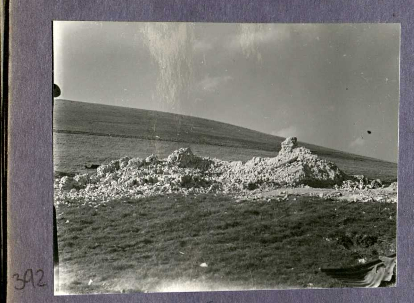 The photograph numbered 392 in the scrapbook is a tragic one. It is of the thoroughly destroyed 12th century Balsdean Chapel. It was deconsecrated and had been in use as a barn. The photo was taken in the paddock between the Manor farmhouse and the row of two farm labourer’s cottages, on or near the same spot as photo 398.