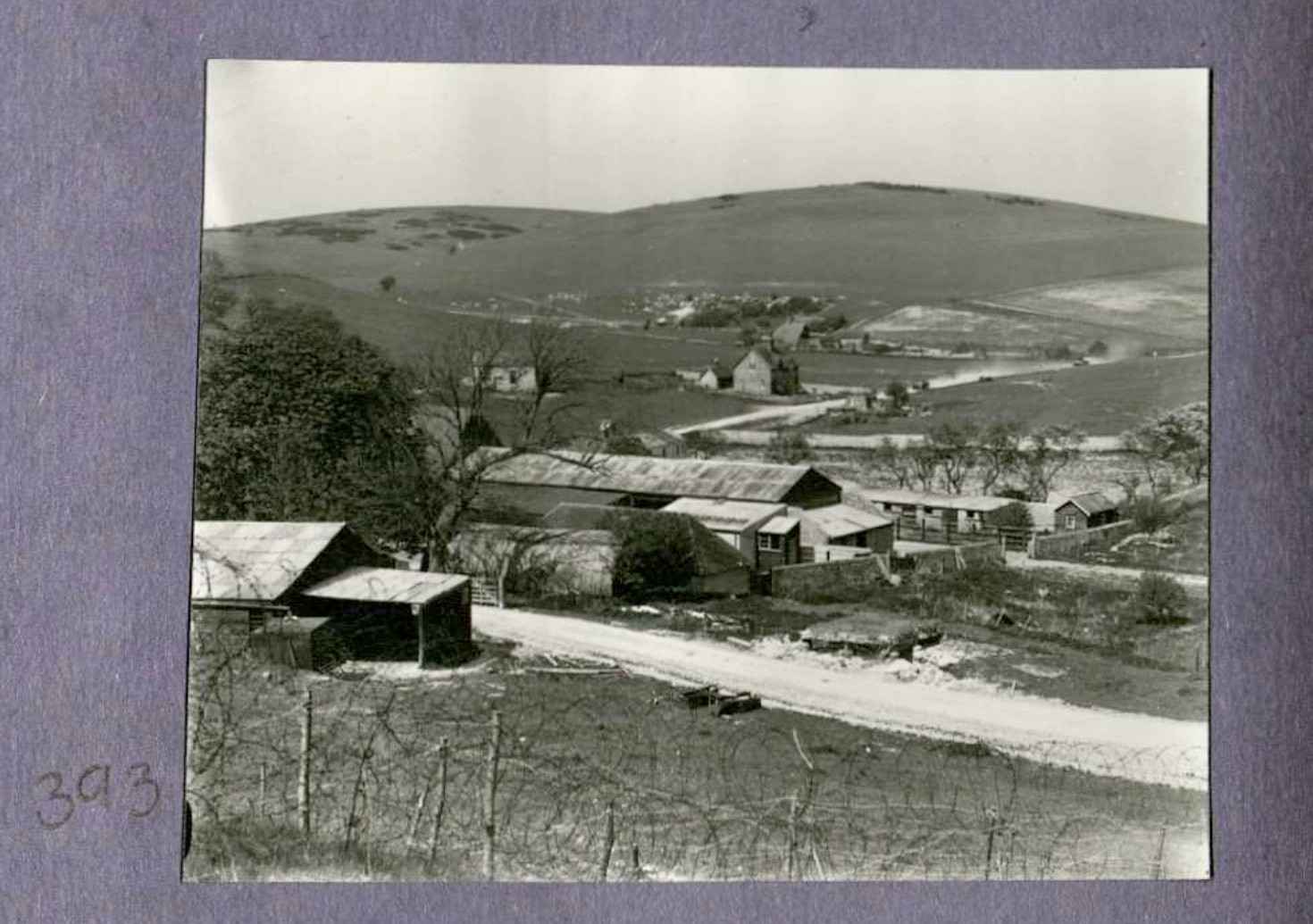 The following photograph (393) shows tanks rolling into an apparently intact Balsdean, behind a double row of military barbed wire. These photographs are not in chronological order for the isolated building slightly left of centre is the Balsdean Chapel, still intact. The War Office requisitioned these downs in May 1942, though the military were training in the area long before this. Of interest is that a copy of this same photograph also exists in my family’s photographic collection. Our copy was from an old Woodingdean friend of my father, Peter Jackson, though he may not have taken the picture himself. He was in the Brighton Railway Home Guard which he probably joined when 18 in about 1944. The track in the foreground is that which follows the valley bottom roughly southwards towards the Balsdean Pumping Station.