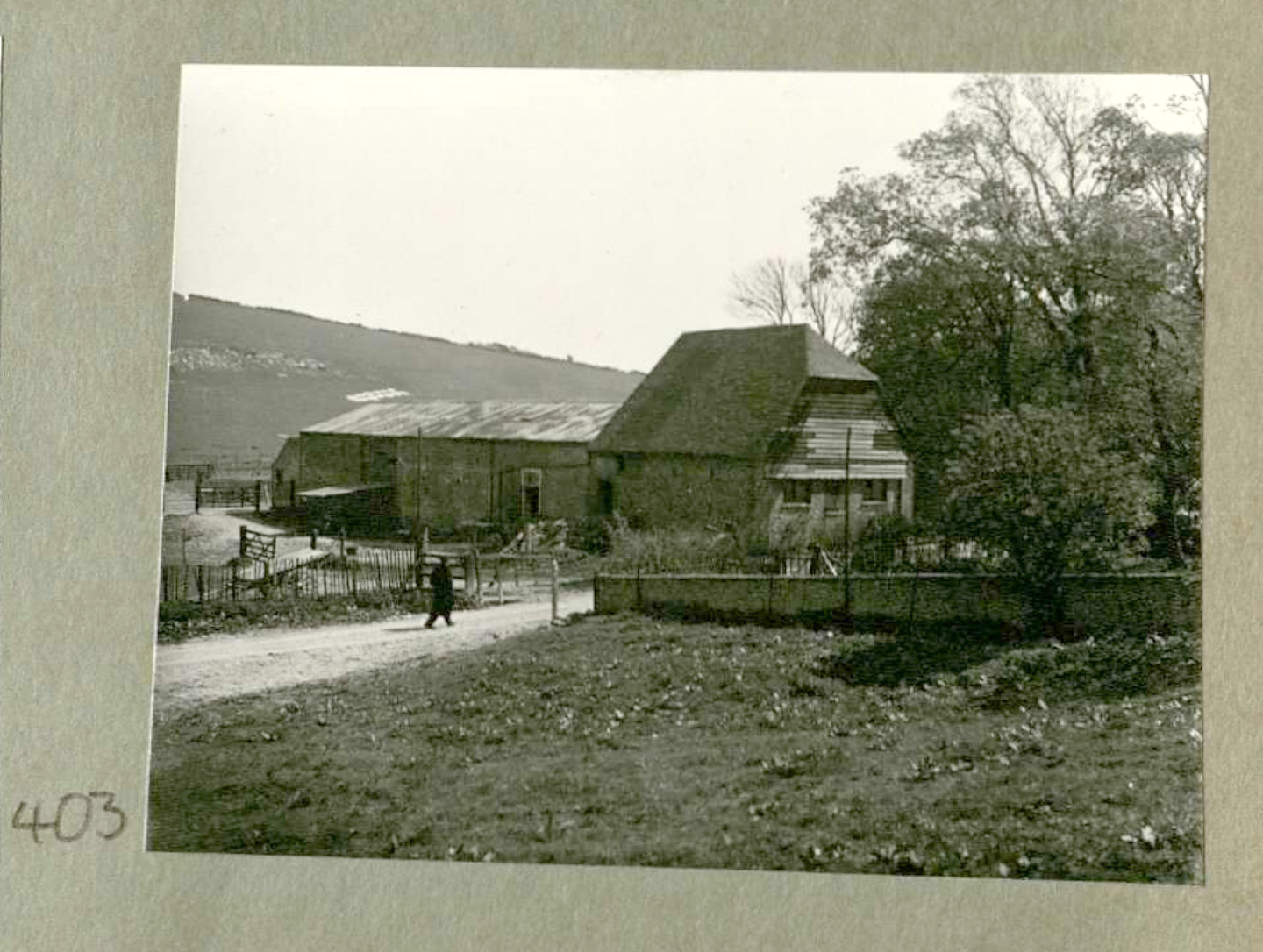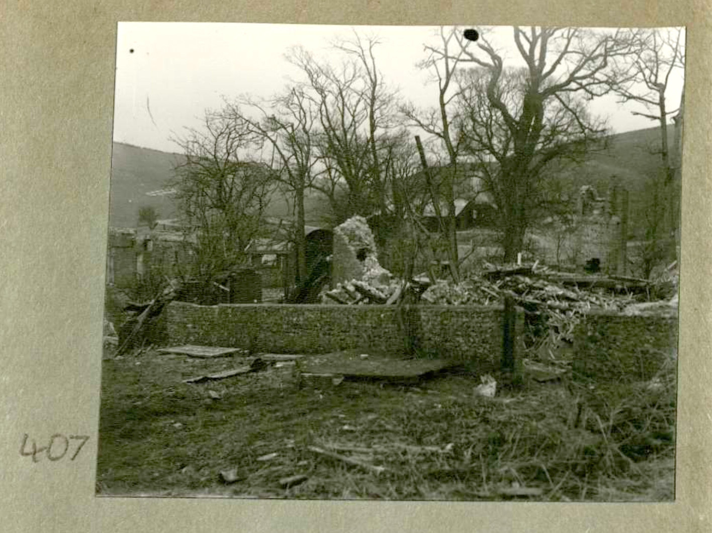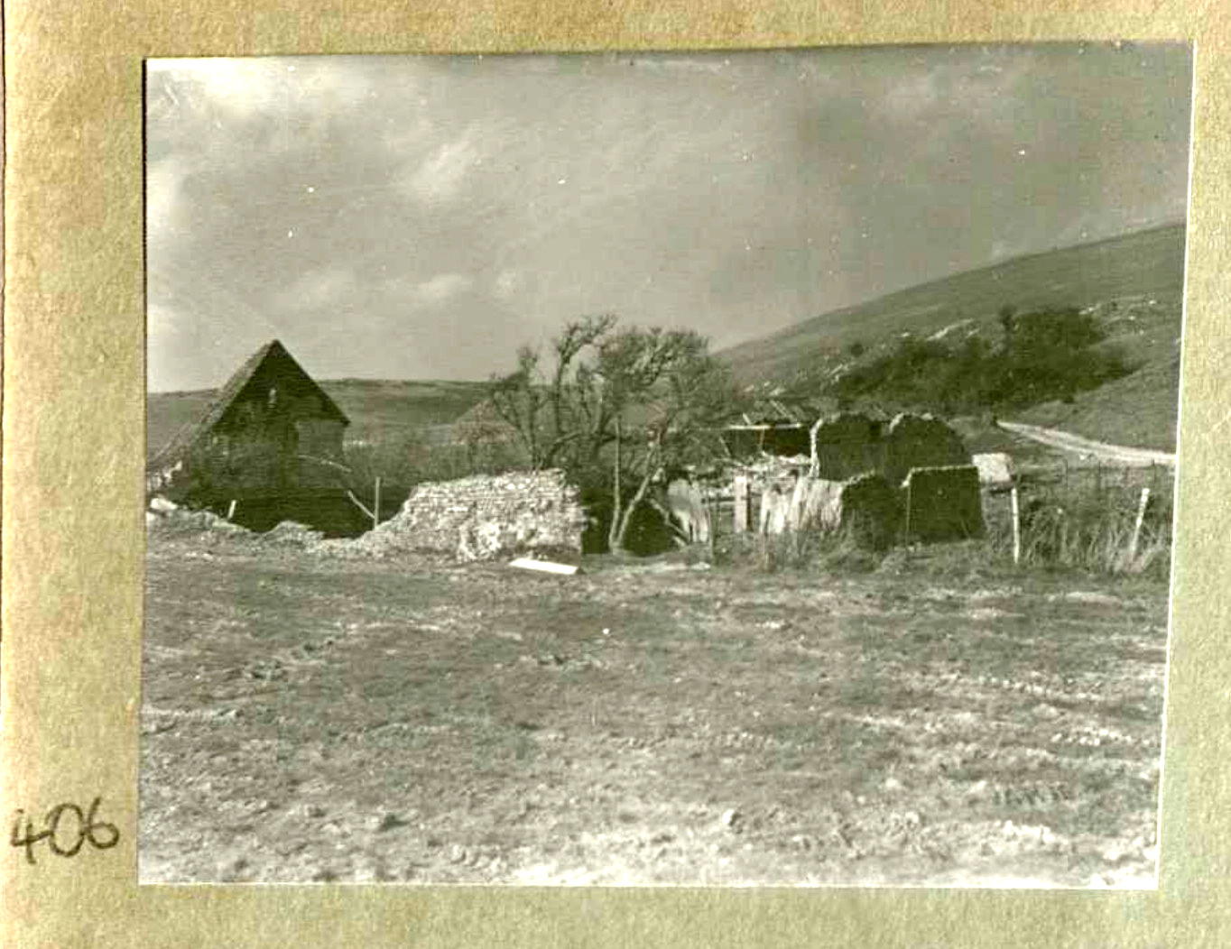 Photograph 402 is of a barn at Balsdean, though I haven’t been able to identify it in any of the other photos. Nevertheless, the hillside in the background is identical to that of photos 396 and 399, suggesting they were taken at the same time. No sign of damage to the buildings so probably these were taken pre- or early war.