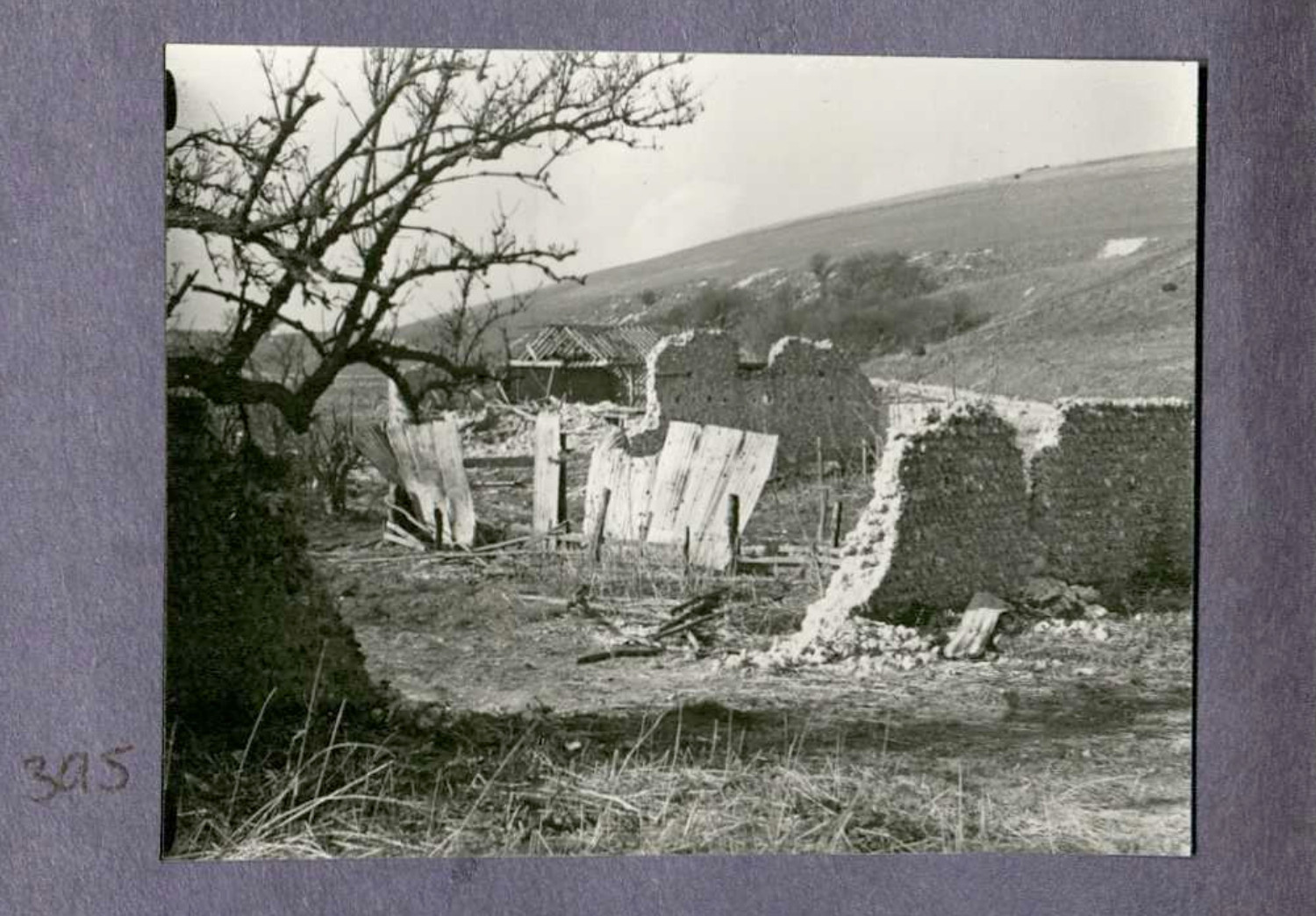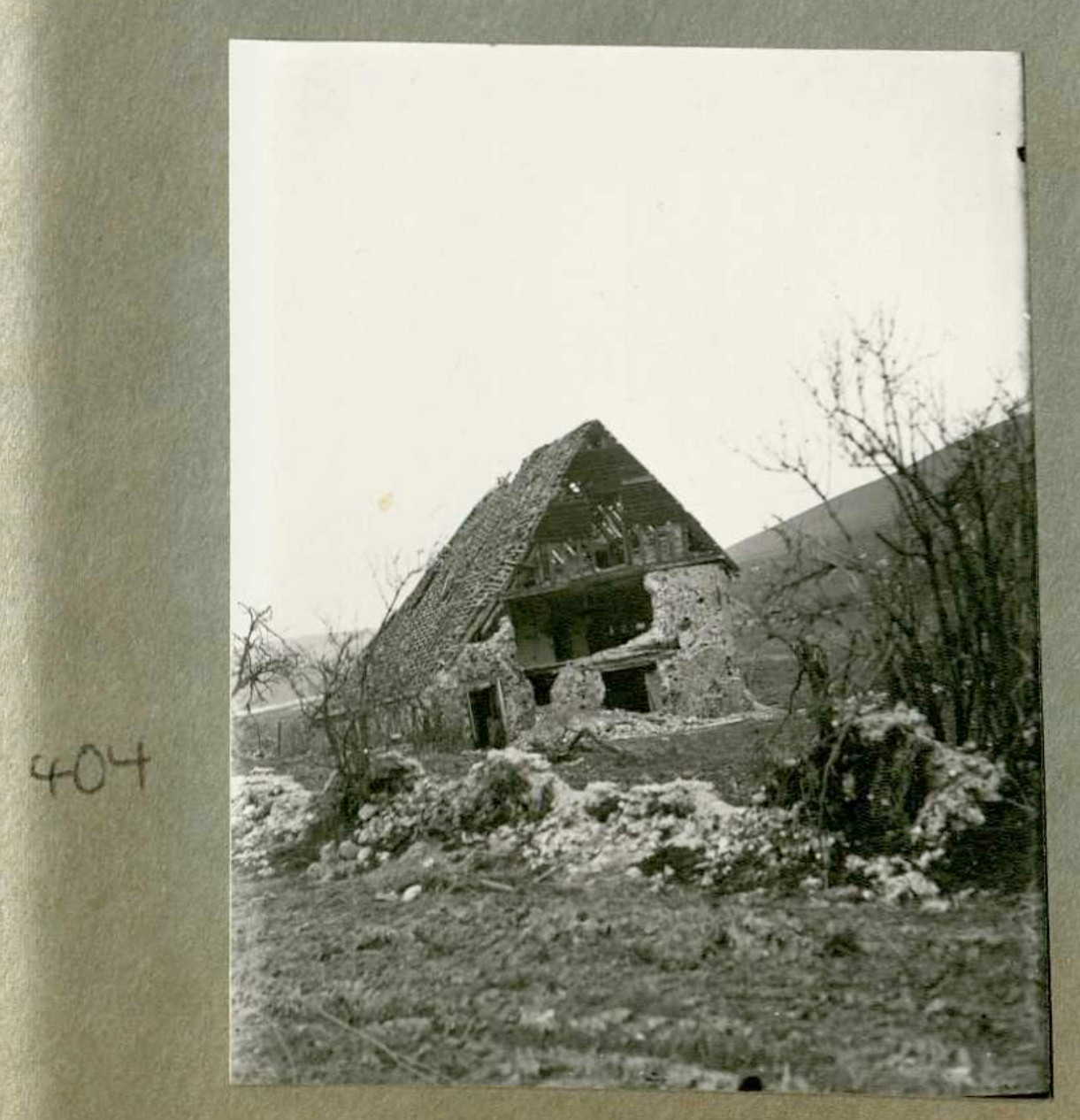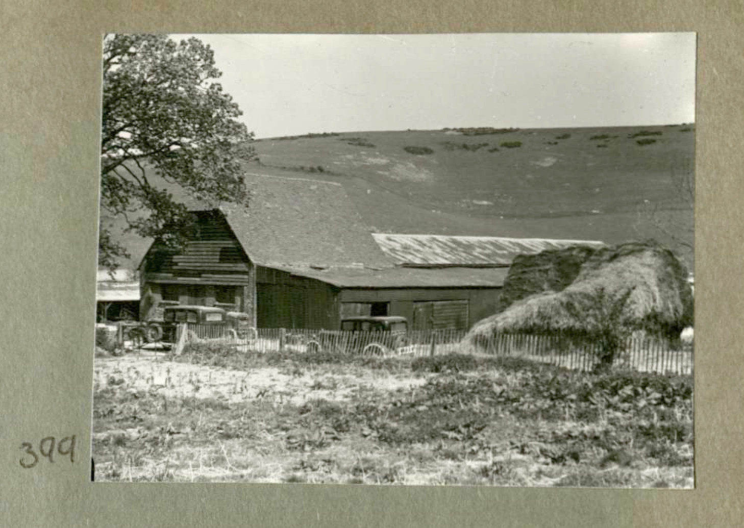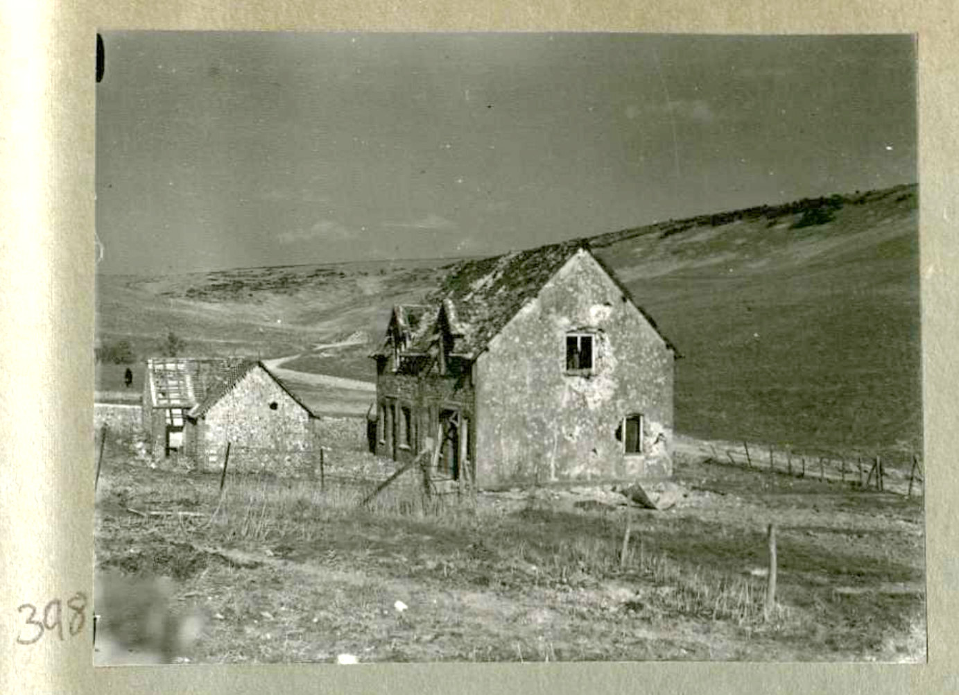 Photograph 402 is of a barn at Balsdean, though I haven’t been able to identify it in any of the other photos. Nevertheless, the hillside in the background is identical to that of photos 396 and 399, suggesting they were taken at the same time. No sign of damage to the buildings so probably these were taken pre- or early war.