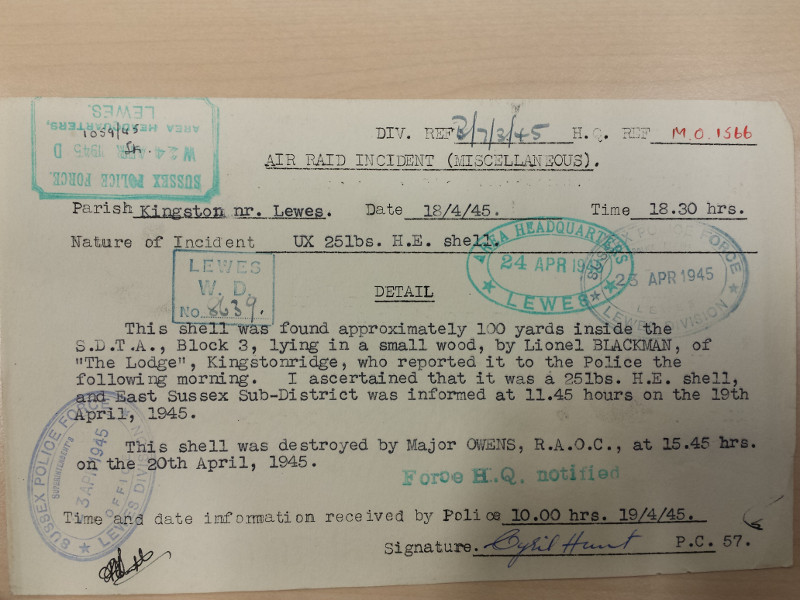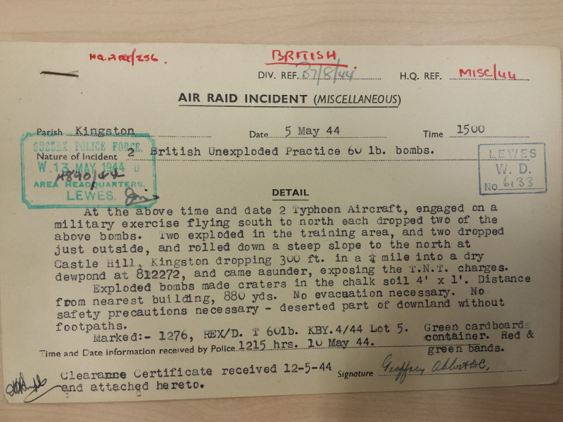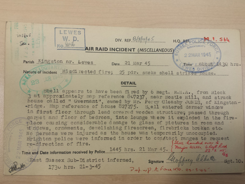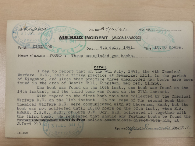 Exercise Exodus was a mustard gas firing training exercise in the Balsdean / Castle Hill area. Winston Churchill had ordered the use of mustard gas if Germany attempted to invade. This would have broken the Geneva Gas Protocol which we signed in 1925. Hopefully these gas ‘bombs’ were empty. My mother’s family were living just one kilometre from where they landed! The training was organised by the Fourth (British) Chemical Warfare Regiment for Canadian officers who had recently arrived in East Sussex.