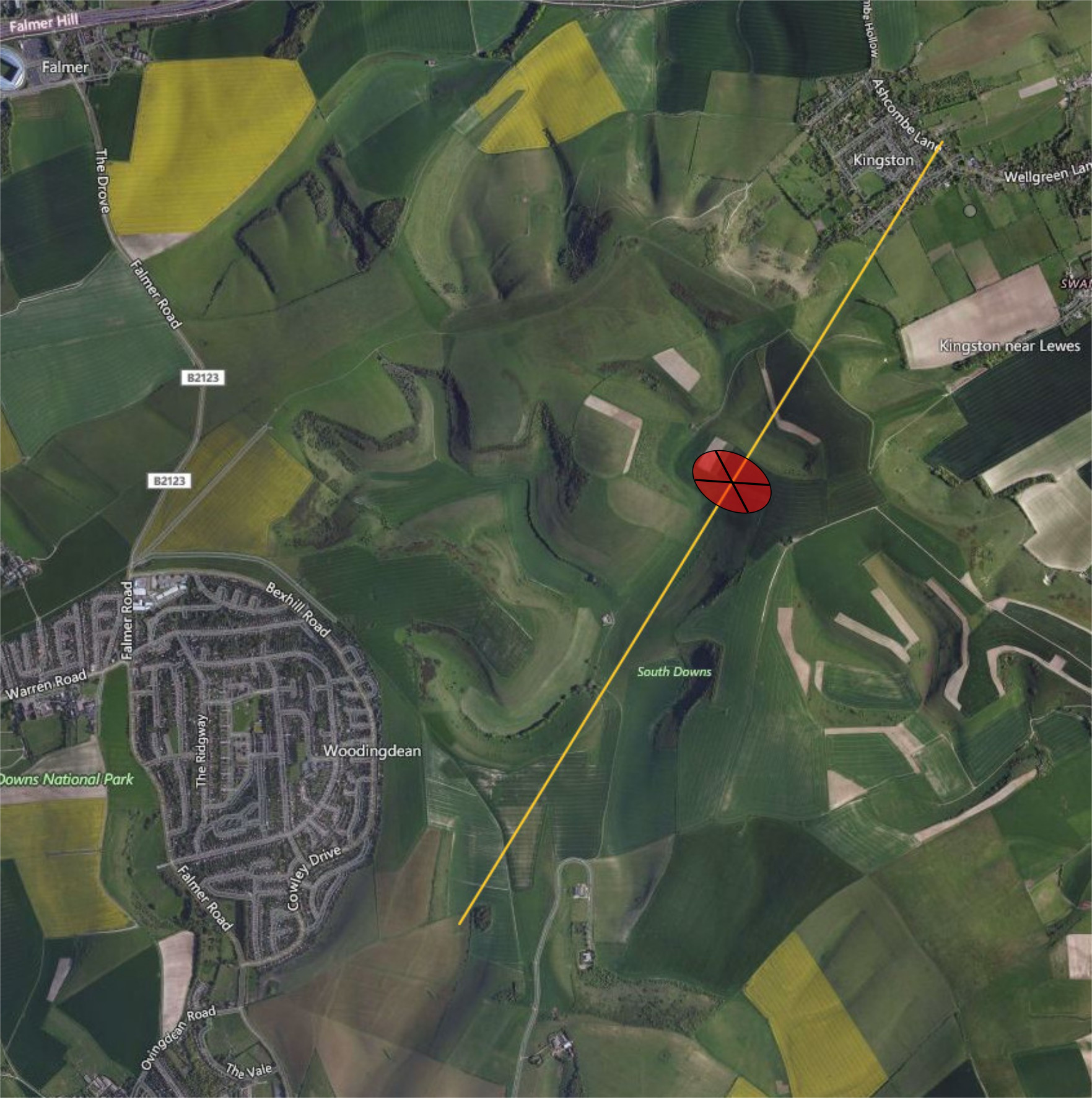 The artillery firing position was hidden behind a ridge south-southwest of Balsdean. The main target (shown in red) was probably the spur (Bird Brow) south-west of Iford Hill, which cuts across the main axis of Balsdean Bottom, half a mile before the ridge above Kingston. The grid reference for where it landed is given at the end of the yellow trajectory line. However, Gwernant was a house about half a mile due west of this location!