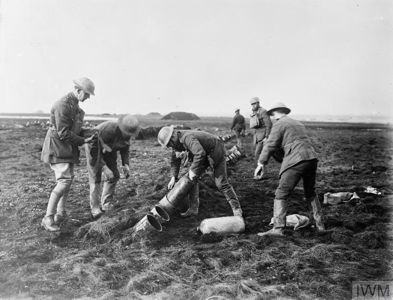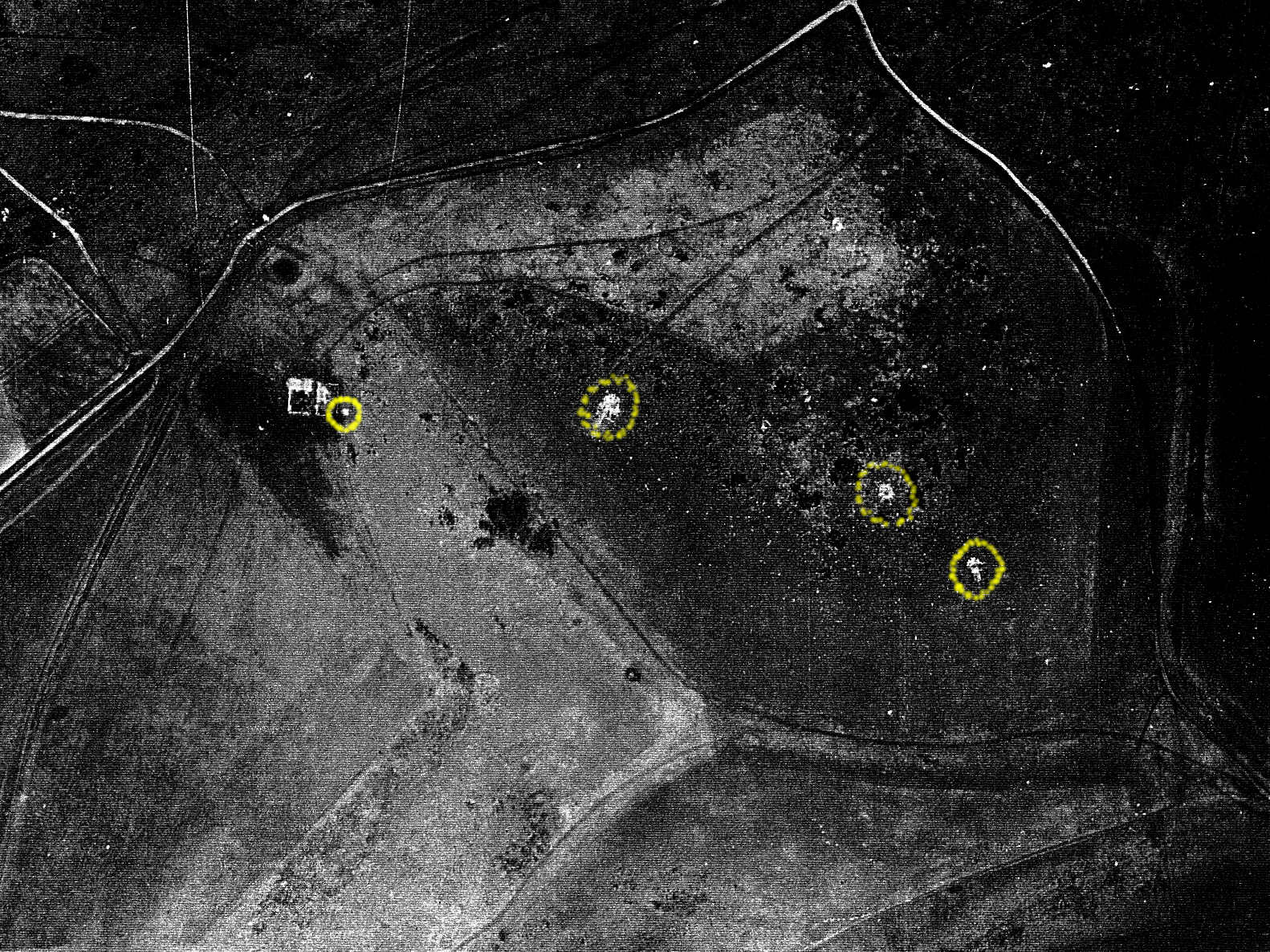 The gas bombs were fired from Livens projectors. These were hollow metal cylinders with a propellant charge at its base. They were buried in a hole in the ground, about 2 feet deep. On the shallow chalk soils of the downs the spoil from their trenches would be easily seen, as in the pictures below.