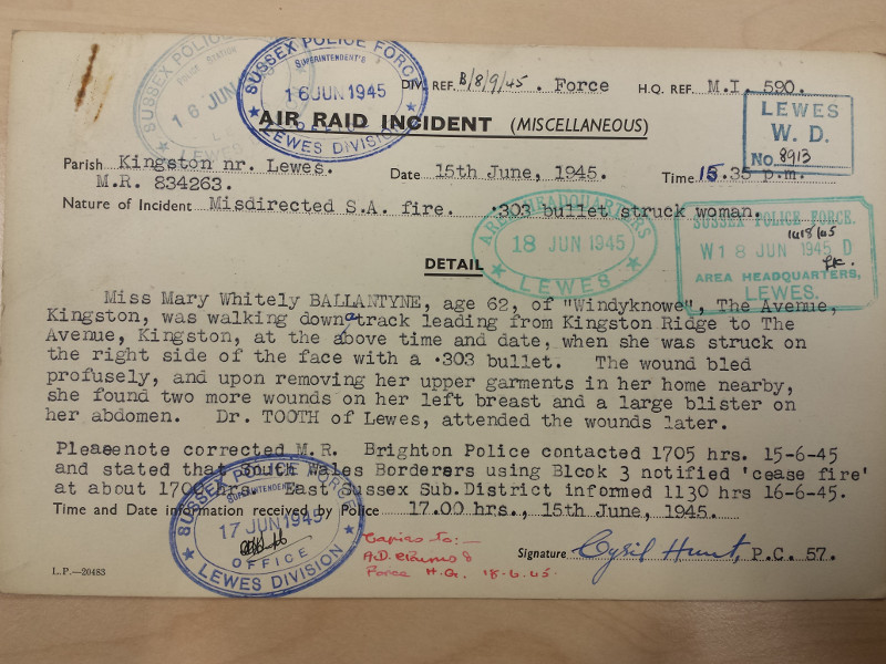 Just one week after V.E. Day, casualties from training for the continuing war in the Far East. Was Miss Ballantyne lucky or unlucky?! The downs associated with the Kingston Ridge were part of the Block 3 South Downs Training Area, so she may have been trespassing. The South Wales Borderers were an infantry regiment. They may have been from the 6th battalion, who had recently returned from fighting in the jungles of Burma, and were due to be sent back to India for an invasion of Malaya.