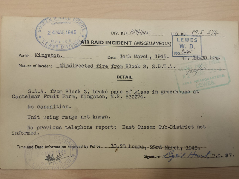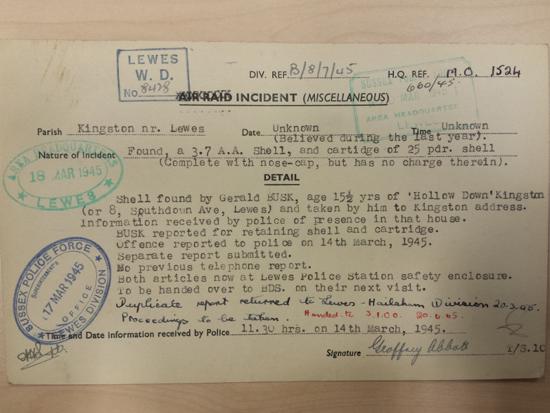 The teenage Gerald Busk may well have been reported to the authorities when they came to investigate Castelmar Fruit Farm’s damaged greenhouse. The collection of shrapnel was a popular pastime with children. Live ordnance was highly valued – but sometimes with fatal consequences.