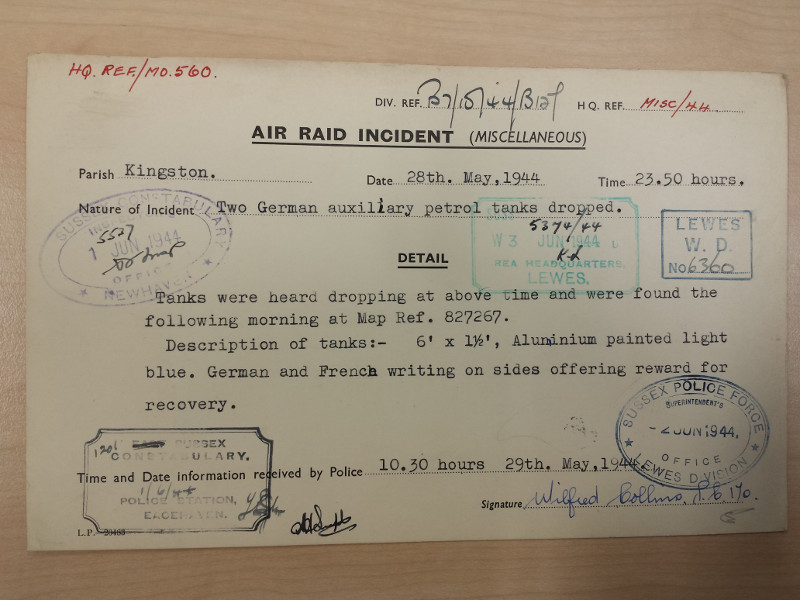 All sorts of things dropped out of skies during the war. Auxiliary petrol tanks were designed to be jettisoned in order to lighten the weight of the plane in an emergency. According to my father, his neighbour told him that during a dog-fight in the skies above Woodingdean, a bullet landed in a saucepan in her kitchen, rattling round and round until it came to halt!