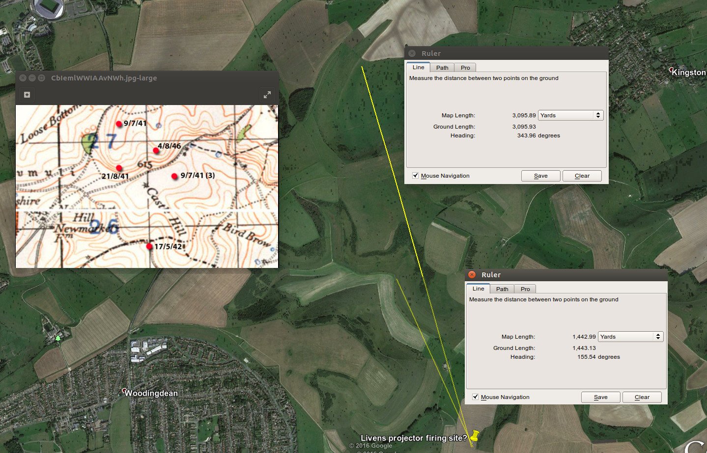 The above three black and white inset photos all show in the background a double row of about 6 chalk excavations; about a dozen in total. When aligned with Google Earth imagery they are clearly the same feature. Those photographs, where the farm buildings are still standing, would have been taken before Balsdean and its surrounding downs were requisitioned in May 1942. The maximum firing distance of a Livens Projector in WW1 was about 1,500 metres. By 1941 significant improvements appear to have been made, but detailed information is difficult to find.