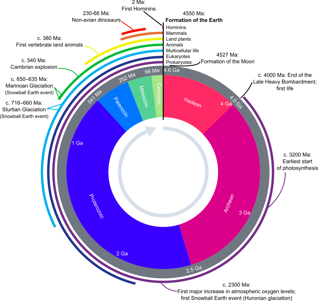 First let us get a quick overview of the Earth’s four eons (the biggest units of geological time). Unlike recent posts, I have tried to be short and to the point, with links to relevant Wikipedia pages for those who want to know more. Further details are intended to be given in future posts. I will also be returning to insights gained from the Gaia theory, but not just yet.
