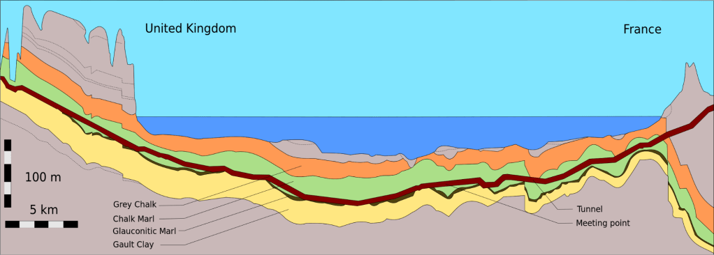 Because these layers have been disturbed by tectonic forces (directly experienced by us as earthquakes) they are not horizontal. Nor do they gently rise and fall like the contours of a wide shallow bowl. I wasn’t able to feel it, but our journey under the channel was in actuality more like a gentle rollercoaster – forced to follow wherever the geological strata took us.