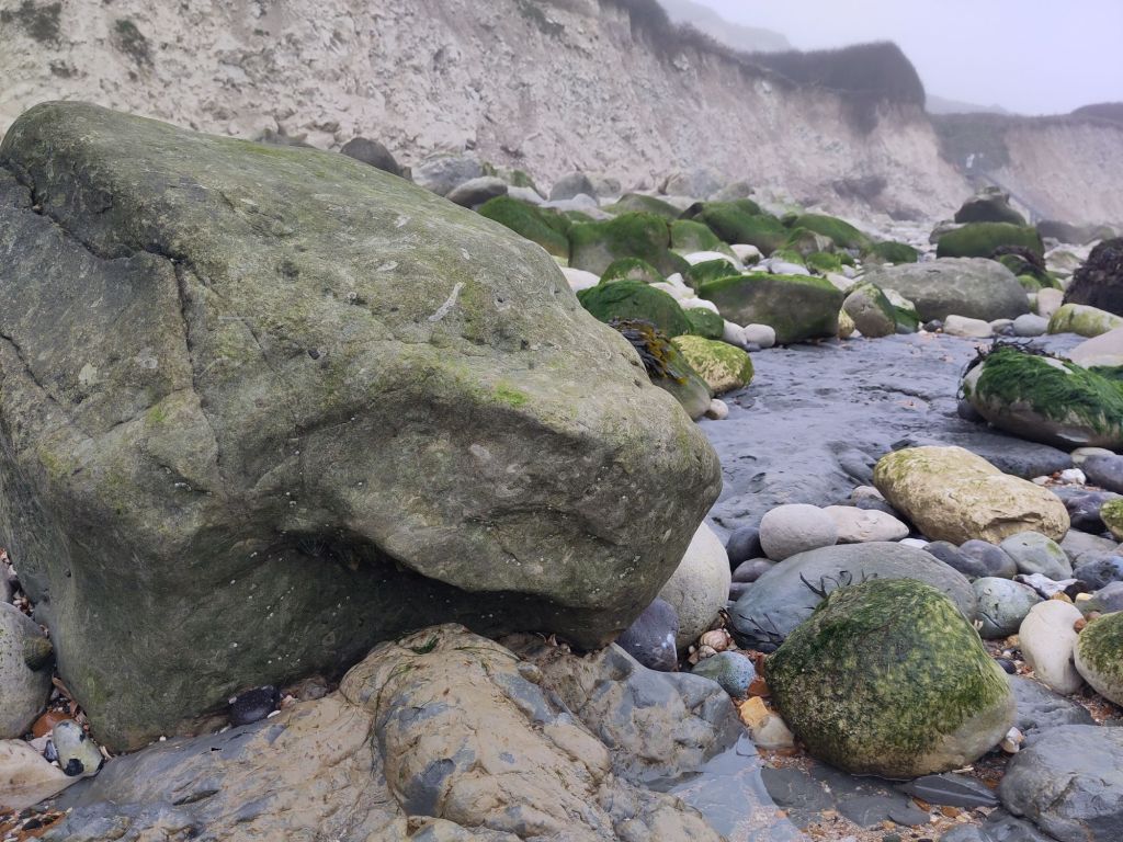 These lowest layers of chalk are exposed to view at Cow Gap, which I recently visited (two excellent guides to its geology and fossils are here and here). The shiny grey coloured rock in my photograph is the underlying gault clay. The green(ish) coloured boulder is upper greensand sandstone which is missing further east near Folkestone. It is replaced by glauconitic marl. Chalk marl and the grey chalk can be seen in the my photo in the cliffs behind.