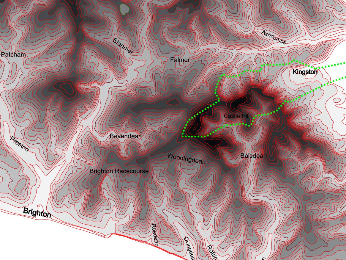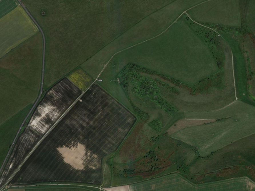 Google Satellite Image of Newmarket Hill, Aerial, Dew Pond, and NW corner of Castle Hill NNR