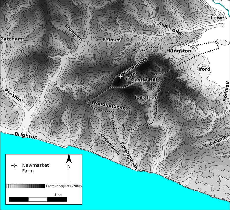 Newmarket Hill is the highest hill of a connecting number of ridges encircling the many valley bottom settlements and farms east of Brighton; Bevendean, Moulescombe, Falmer, Ashcombe (south), Southover (near Lewes), the villages of the lower Ouse Valley, Balsdean, Rottingdean, Ovingdean, Roedean, and Whitehawk. In prehistoric times such ridges were used as trackways. Newmarket Hill, at the centre of this web of ridges and valleys between Brighton and Lewes, would have seen much traffic over the ages.